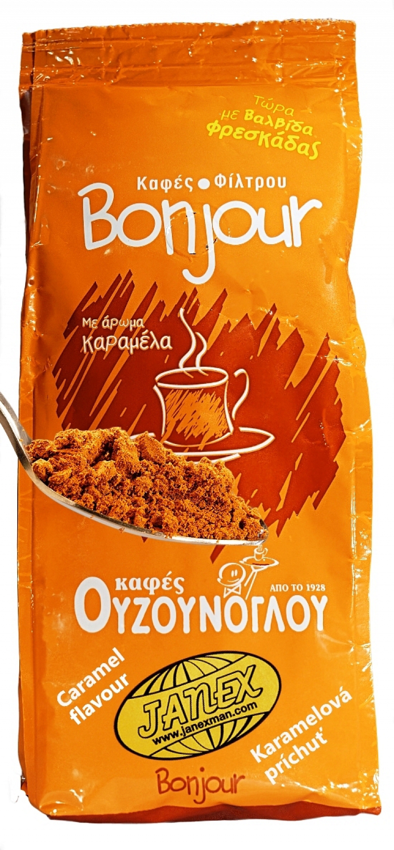 Ouzounoglou, 100% arabica mletá káva pražená Bonjour 250g s príchuťou karamel, pôvod Brazília, Miesto praženia: Grécko vákuové balenie: 250g s príchuťou karamelu Výrobca: SONS G. OUZOUNOGLOU S. A.