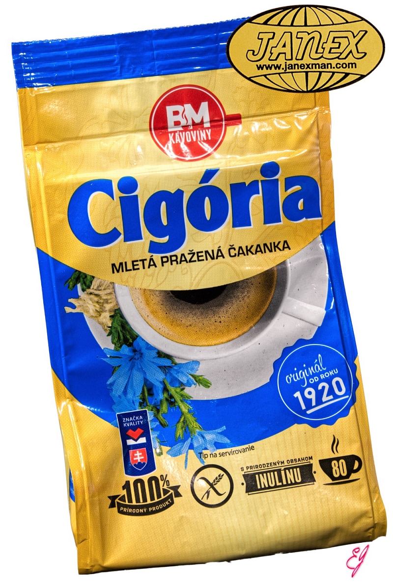Cigória - mletá pražená čakanka Jedinečná pražená kávovina, vyrobená tradičným spôsobom praženia koreňov čakanky - s prirodzeným obsahom inulínu min. 35 %. Nápoj ulahodí nie len milovníkom lahodnej chuti, ale aj zástancom zdravého životného štýlu. Čakanka prirodzene neobsahuje glutén, preto je vhodná aj pre celiatikov.